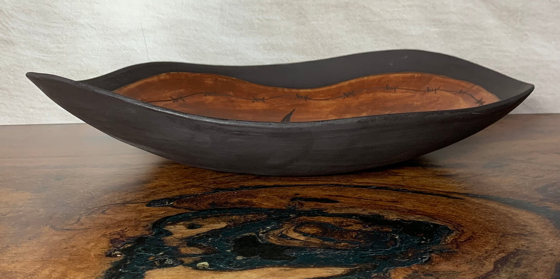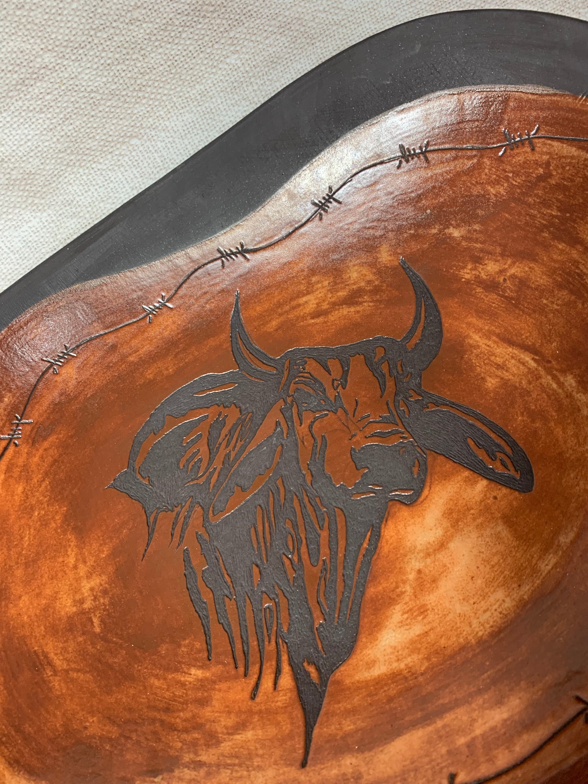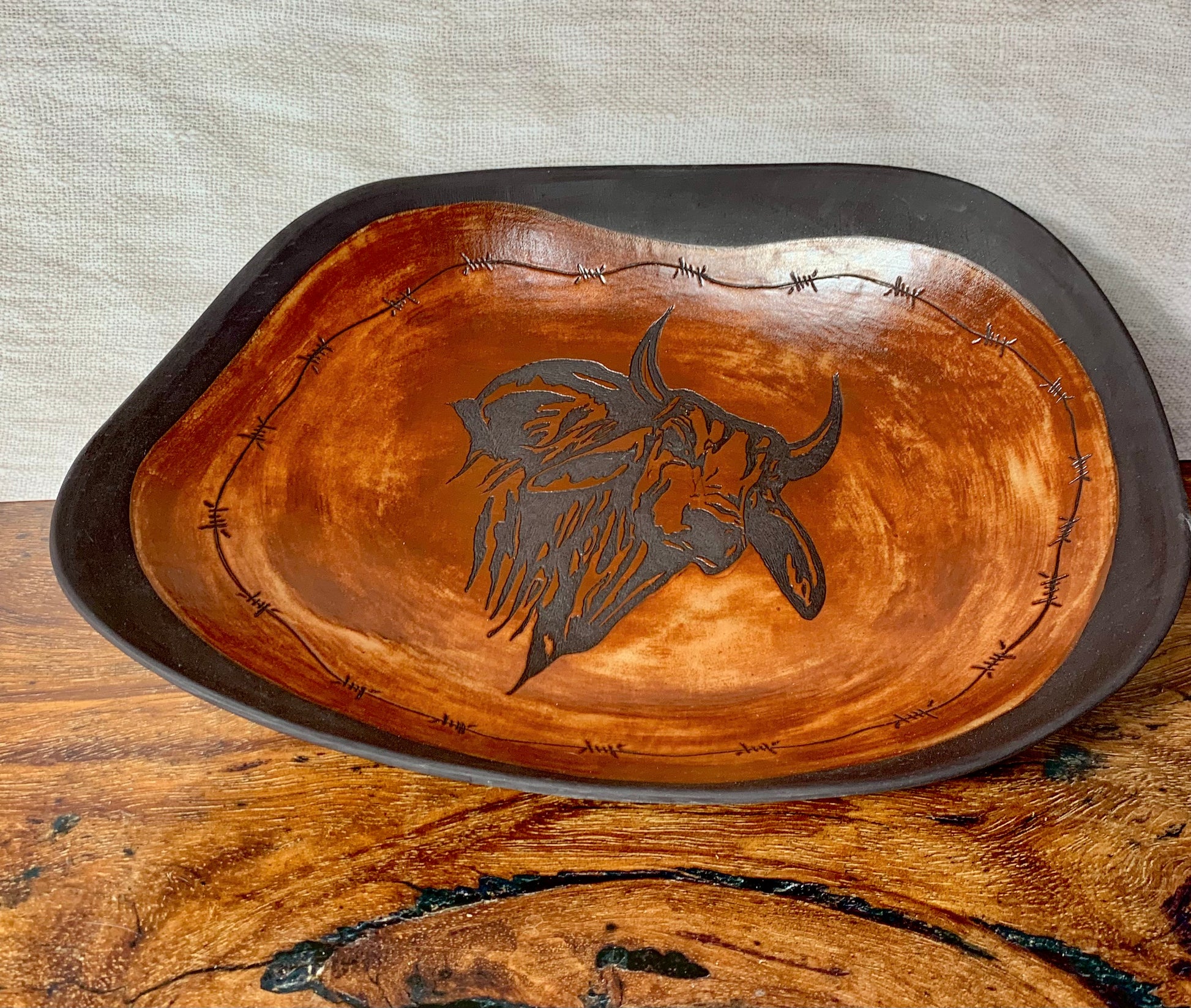 A hand carved Brahman Bull. This platter is hand moulded using black clay and has a beautiful rustic coloured glaze. The black clay contrasts beautifully with the almost leather like glaze.
