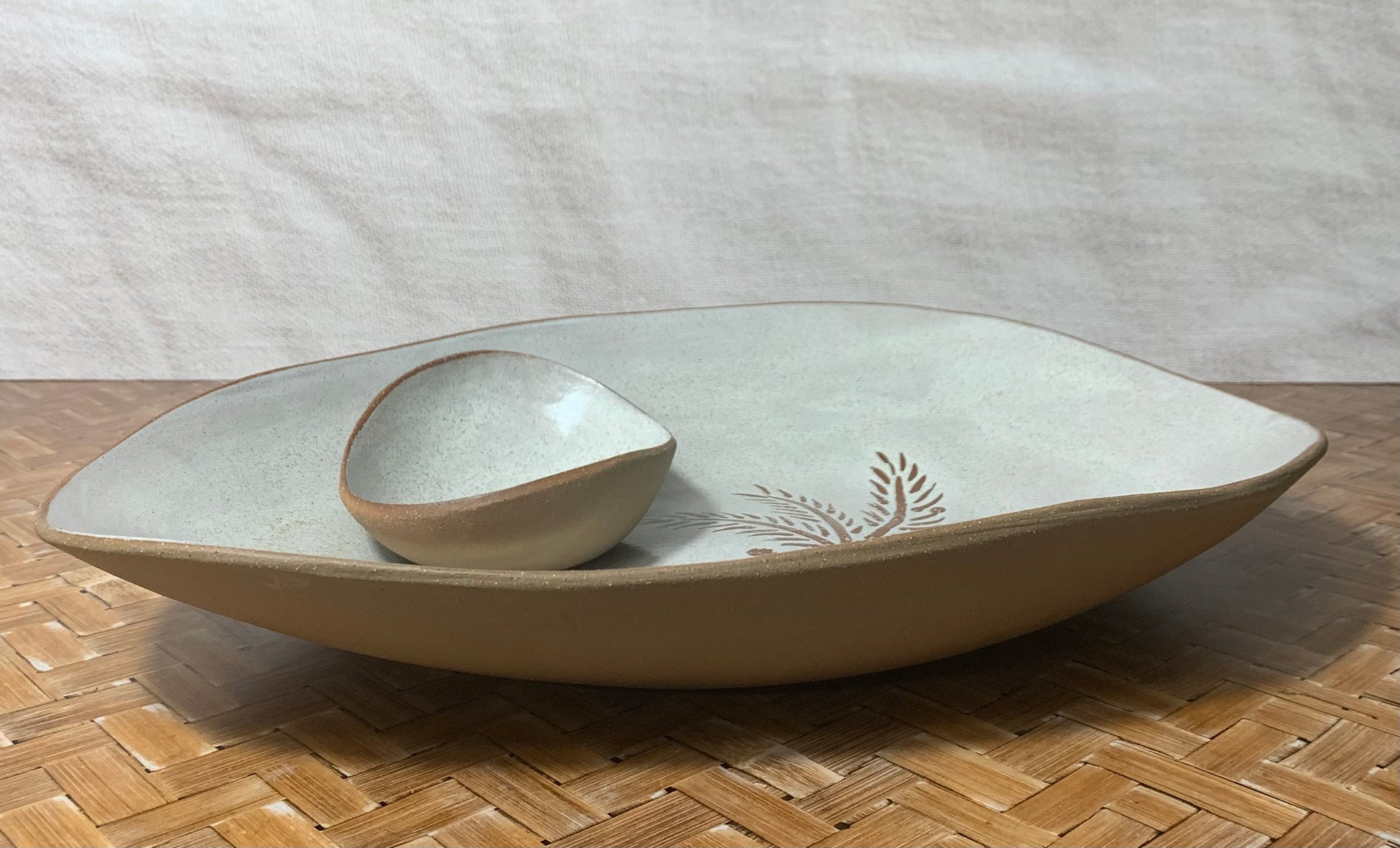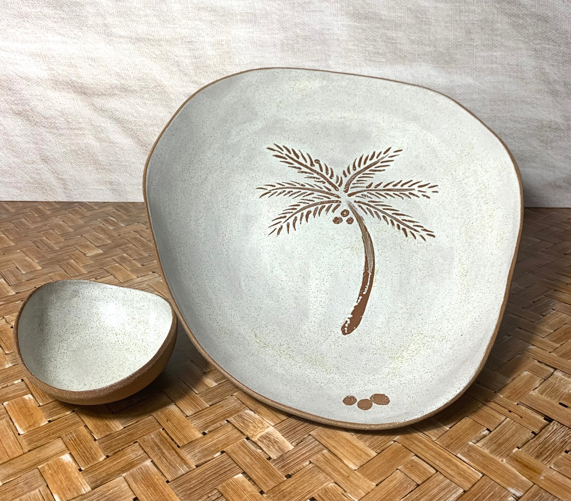 A smooth speckled clay that once fired resembles wet sand. This clay has been hand moulded and glazed with a white speckled glaze . The image was drawn by hand in wax so that after firing the colour of the clay shines through producing the palm tree image.