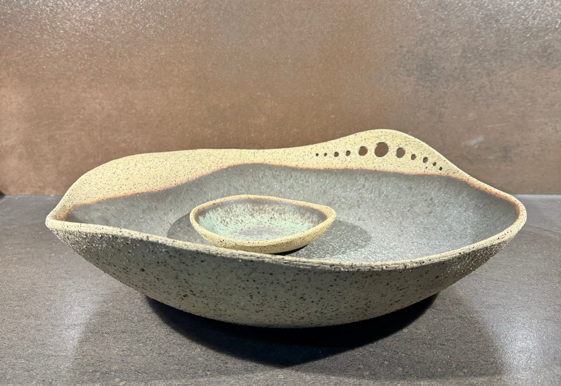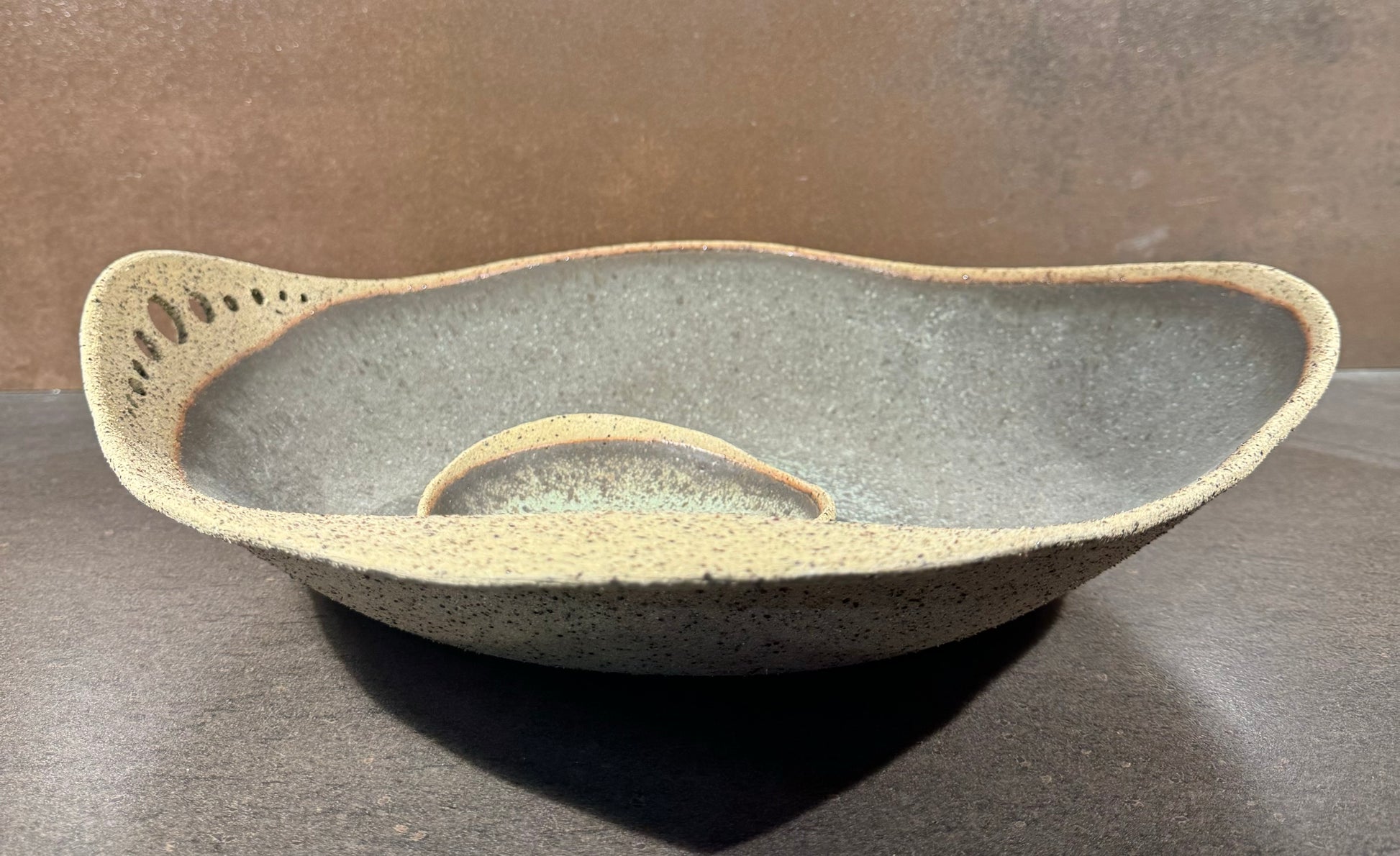 A gritty sand textured serving bowl with a sage coloured glaze that turns a rich chocolate in areas.