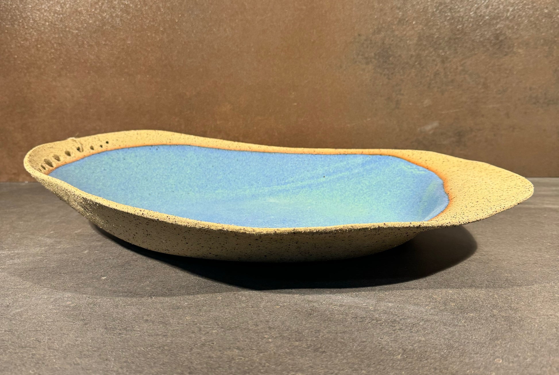 A hand moulded gritty textured clay with a beautiful blue/green glaze. This glaze produces more green or blue tones on each individual piece making all items one of a kind.